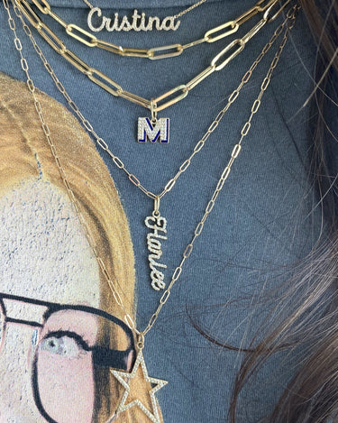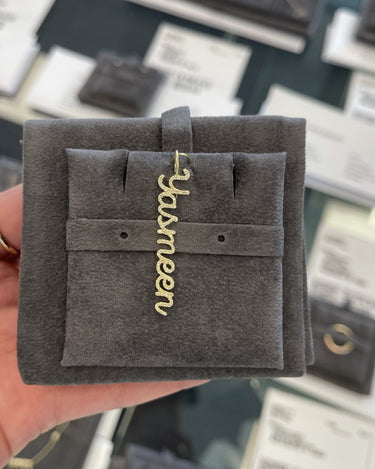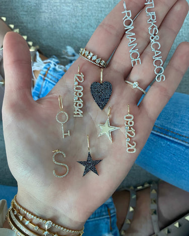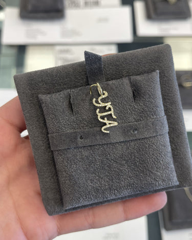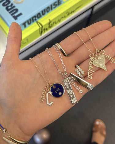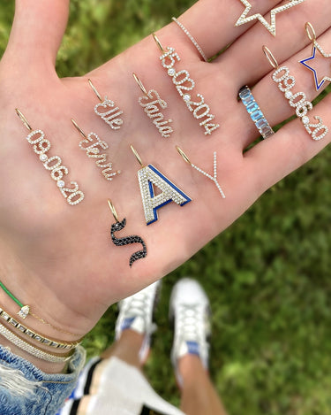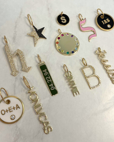 Build this best seller 14k solid gold name charm, starting with the name of your choice, and add up to 12 initials, all on a dainty hoop that fits through all of our chains, available in 14k white, yellow, and rose gold, it makes for the perfect bespoke charm, wear it day or night, its the perfect everyday dainty piece.