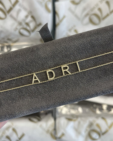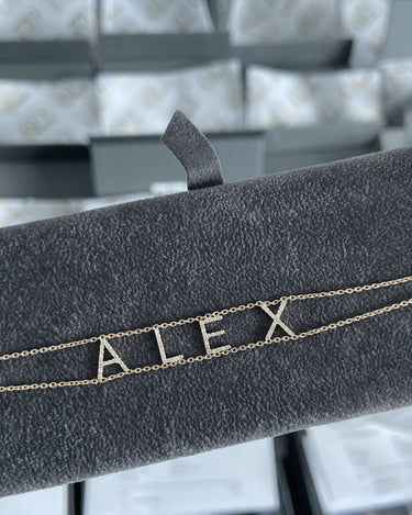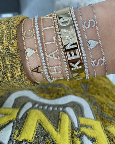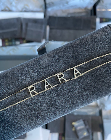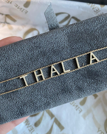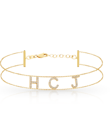 A custom initials bracelet allows you to choose up to 10 diamond letters to create a custom, one of a kind piece. Set in 14k gold on delicate chains, simply choose the amount of letters for your bracelet and write in the corresponding name in the field.