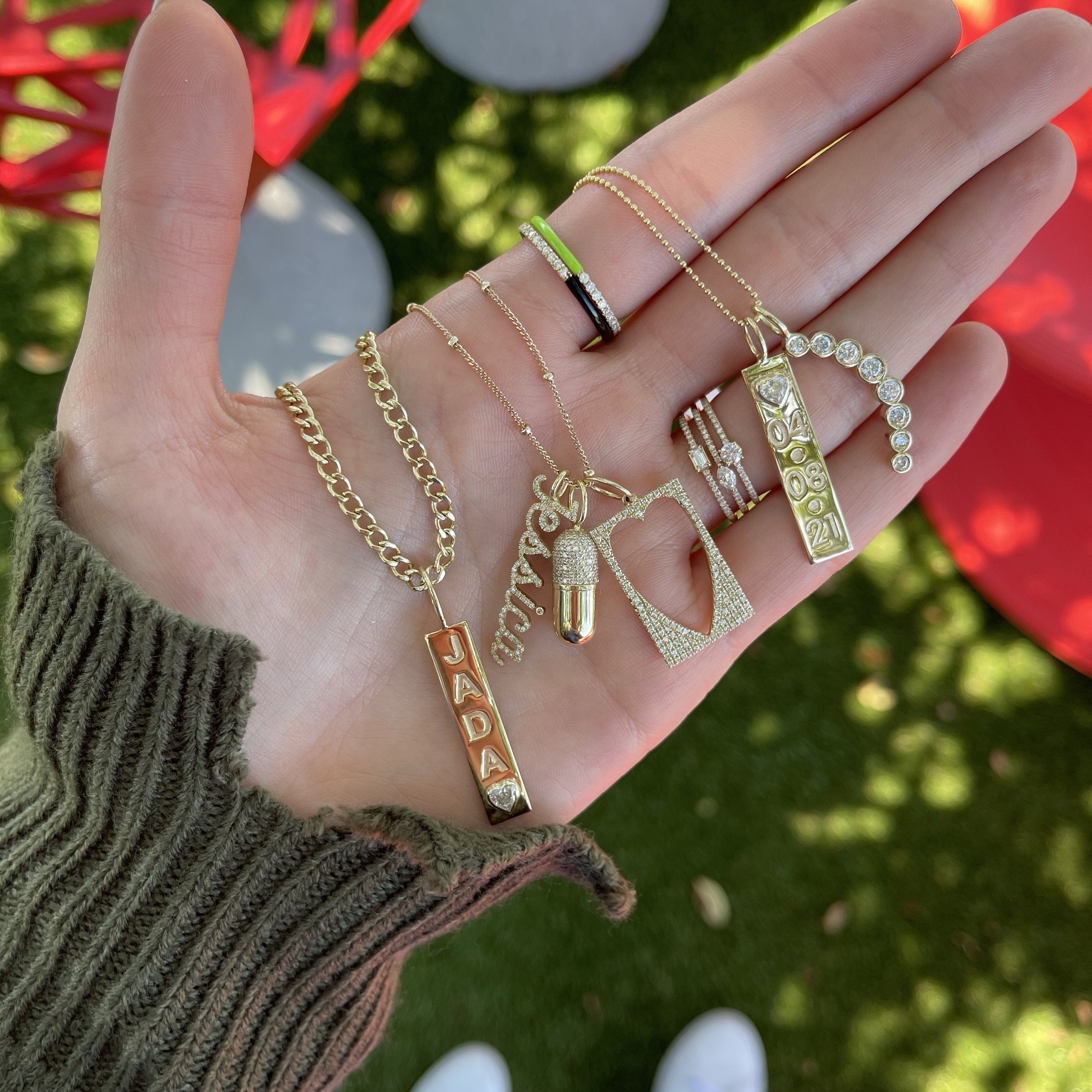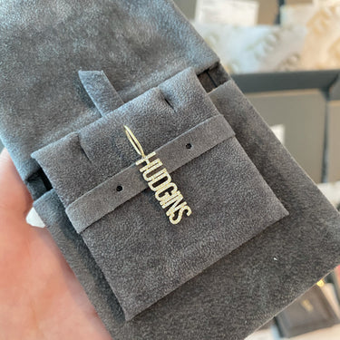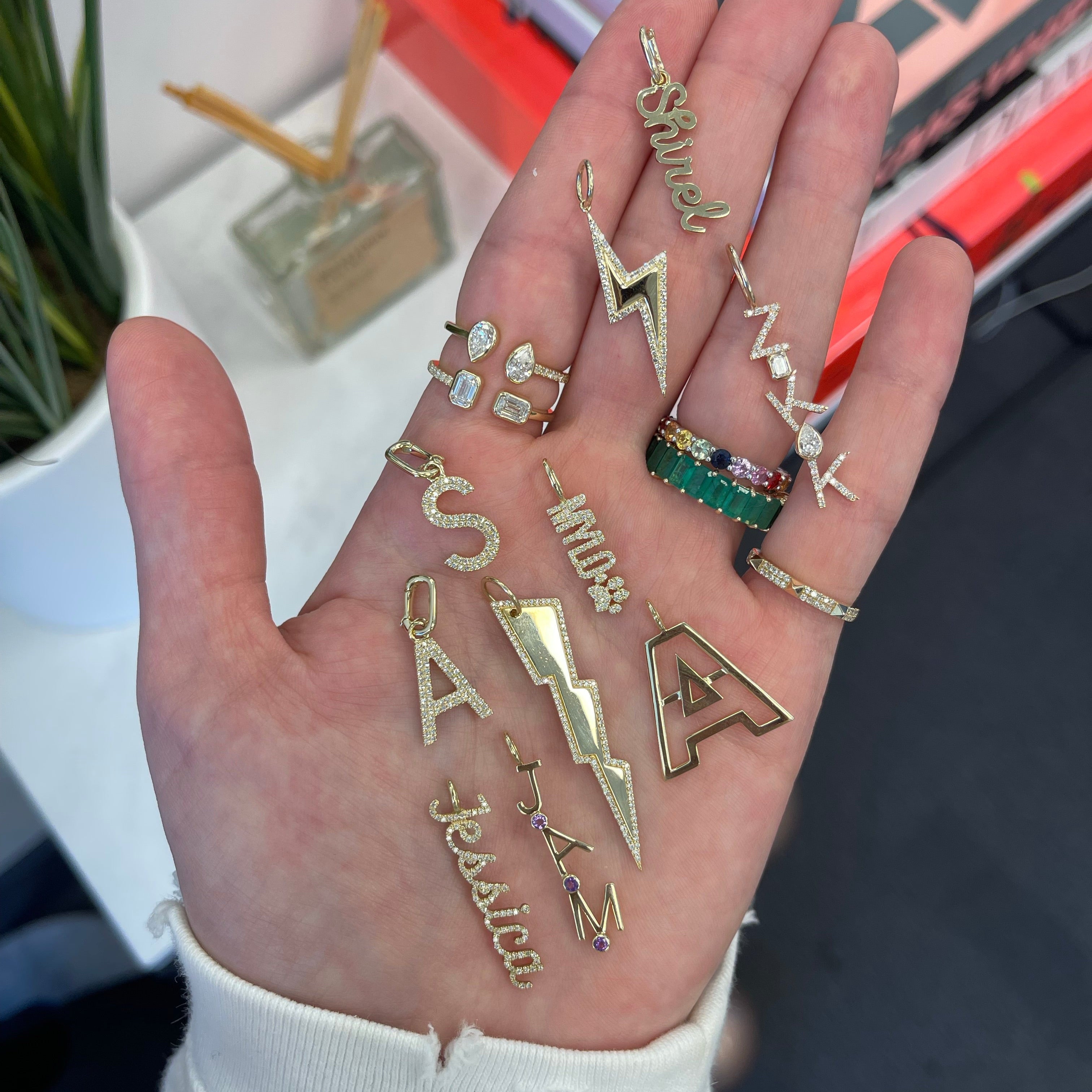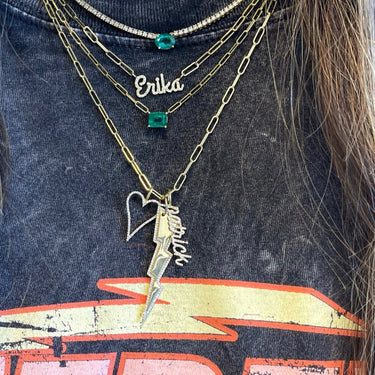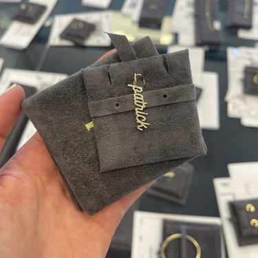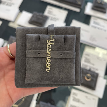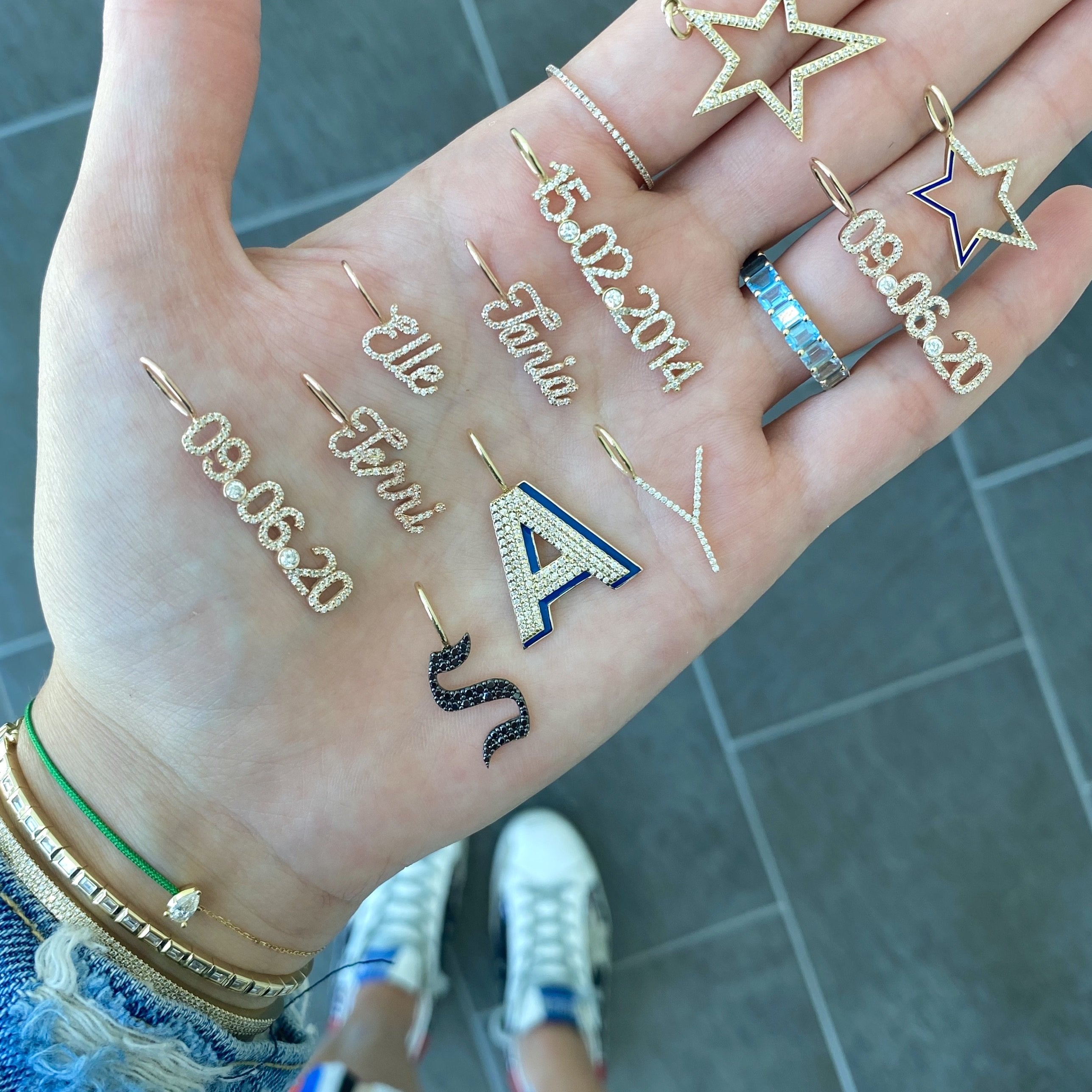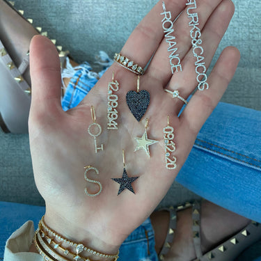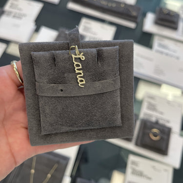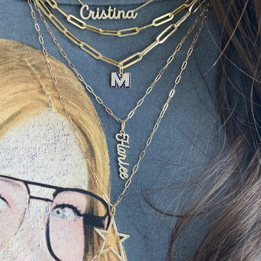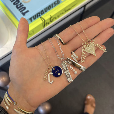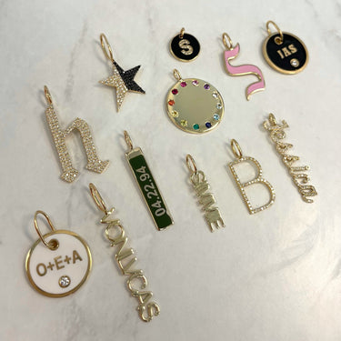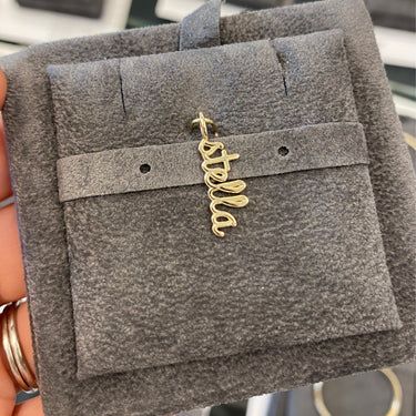 Build this best seller 14k solid gold name charm, starting with the name of your choice, and add up to 12 initials, all on a dainty hoop that fits through all of our chains, available in 14k white, yellow, and rose gold, it makes for the perfect bespoke charm, wear it day or night, its the perfect everyday dainty piece.